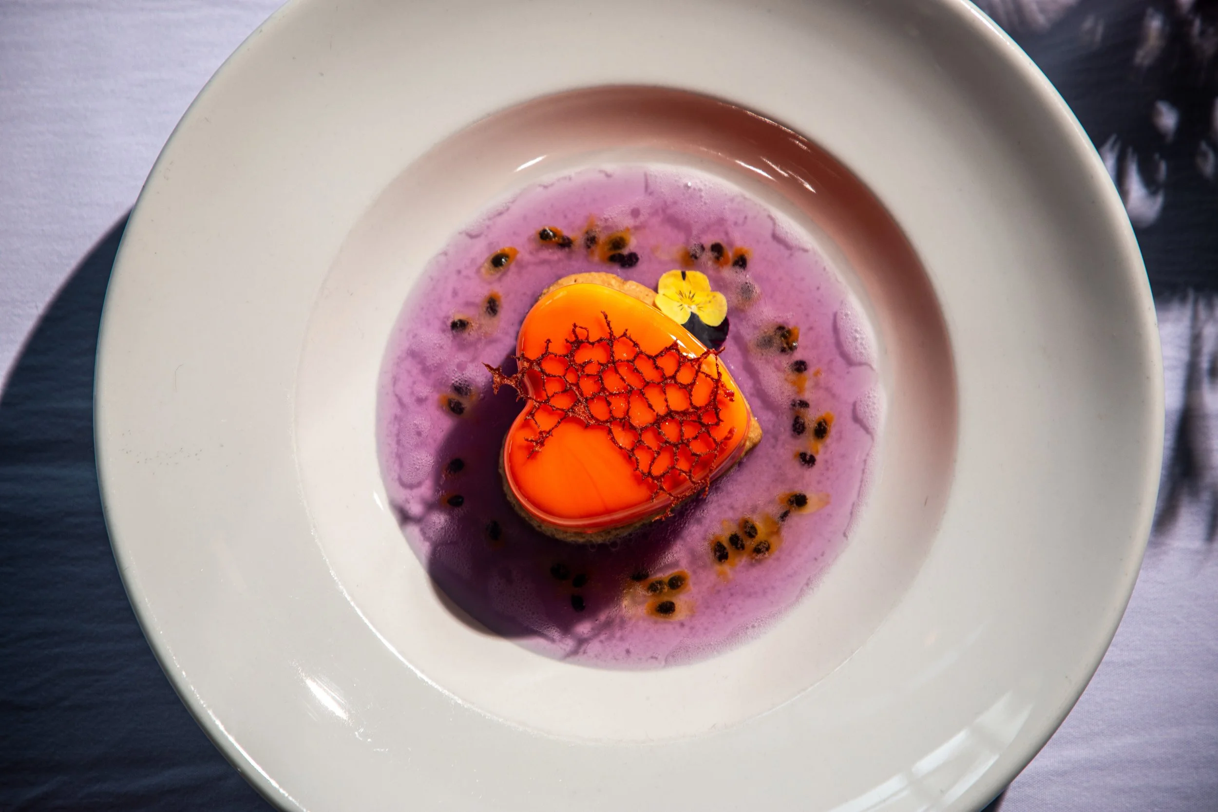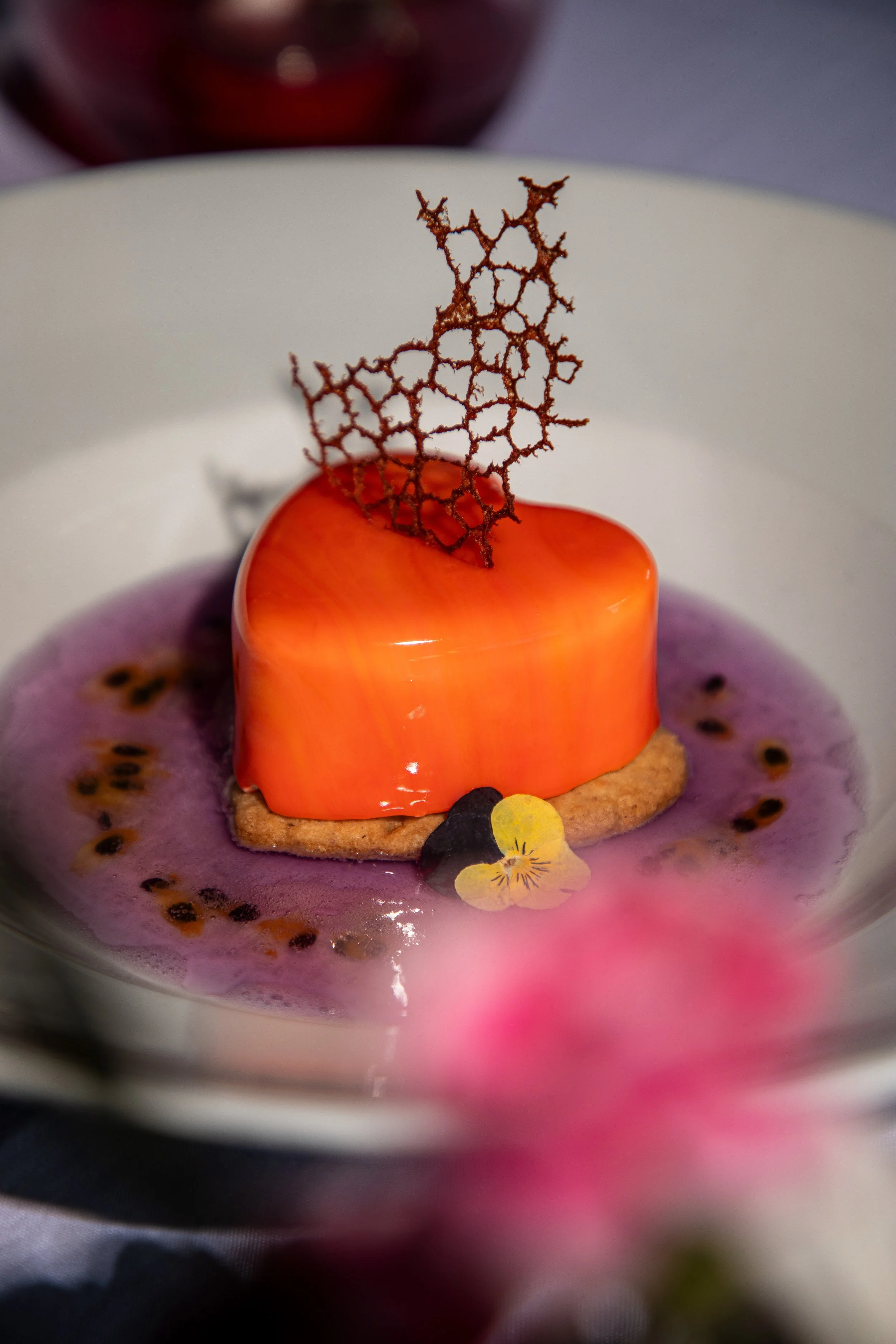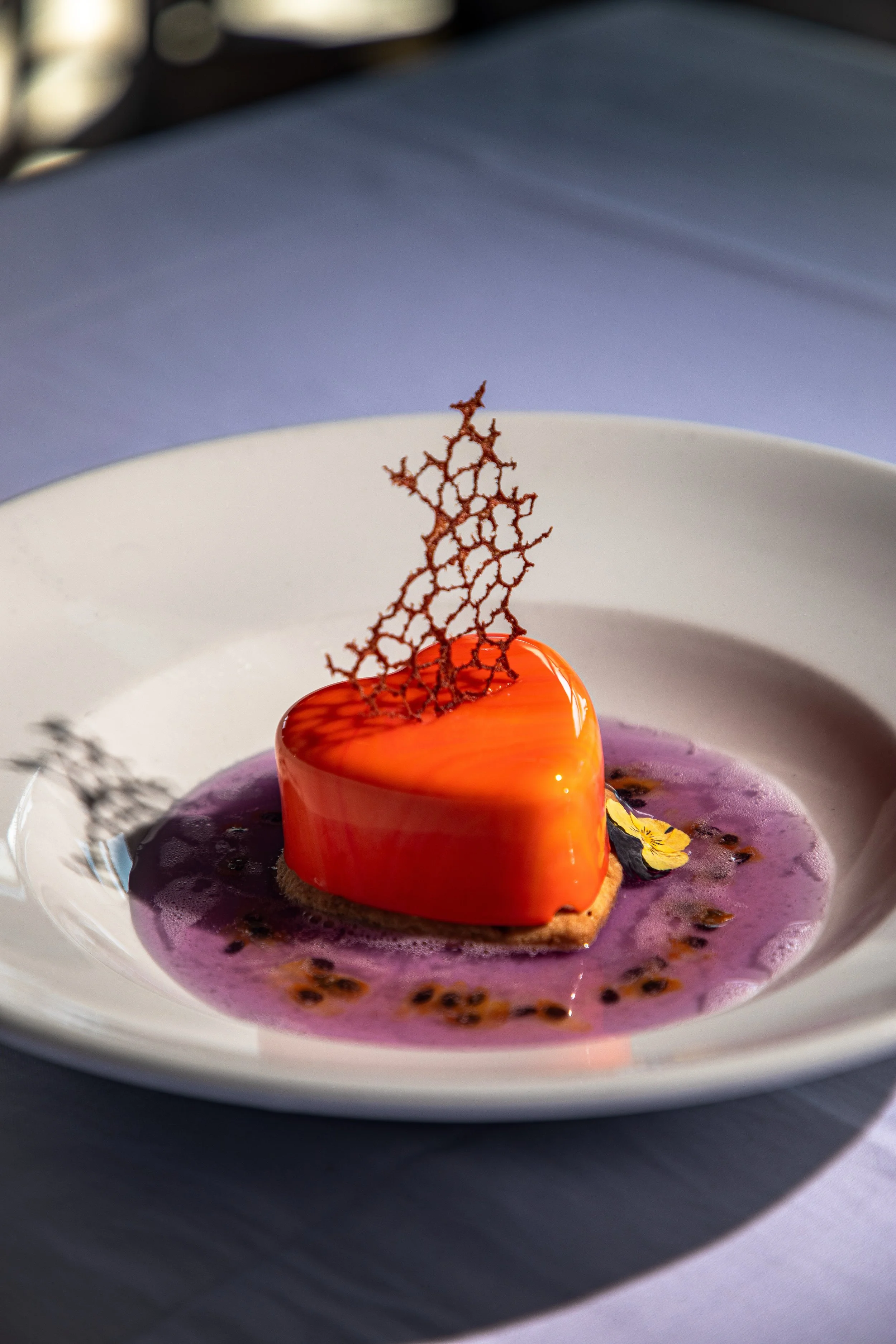 Delicate coconut mousse melts into a crisp graham cracker shortbread, surrounded by passionfruit butterfly pea tea lemonade kissed with fresh passionfruit seeds. Light, sensual, and unforgettable—crafted exclusively for Valentine’s night.